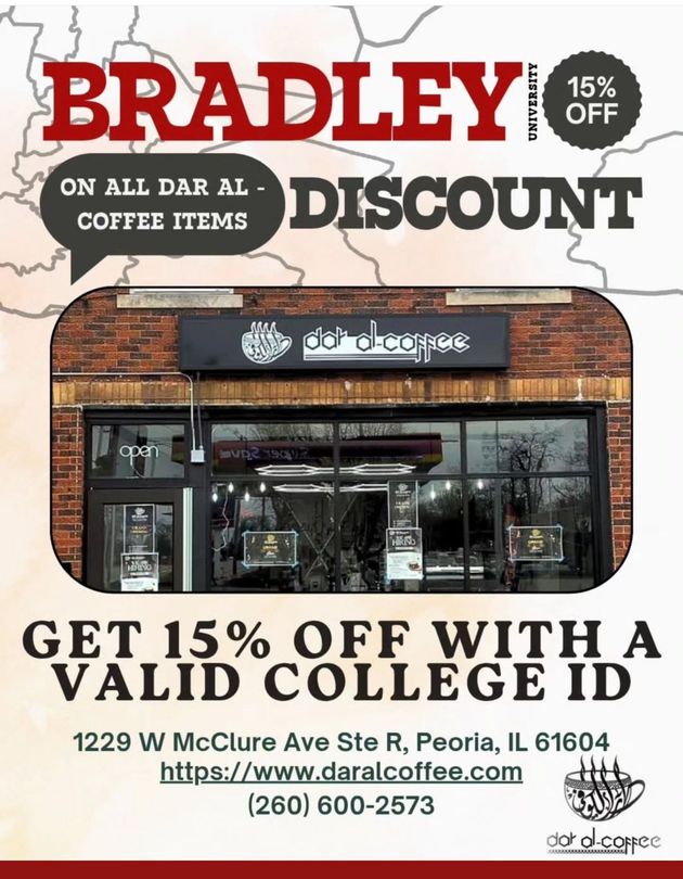 Check out our traditional Yemen coffees and fresh pastries today. Just a mile from campus, Dar Al-Coffee is fast becoming a favorite Bradley student hangout spot for those in the know.